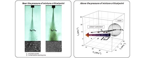 To evaluate the optimum operating conditions for the micronization of cyclotrimethylenetrinitramine (RDX) crystals using the Supercritical Anti-Solvent (SAS) process, a predictive approach incorporating the Hansen solubility parameters and jet behavior analysis has been suggested. The crystals were characterized by field emission scanning electron microscopy (FE-SEM), X-ray diffraction, and particle size analysis. Near the mixture critical point, the jet behavior and corresponding FE-SEM images of the particles indicated that agglomerations were present at pressures below that of the mixture critical point. On the other hand, for conditions above the mixture critical point, the relative energy difference values were calculated using the Hansen solubility parameters to compare the effectiveness of the carbon dioxide and acetone mixture as an antisolvent. Our analysis was supported by the micronized RDX particles with a lesser degree of agglomeration at the temperature of 65 °C, the pressure of 11 MPa, and the concentration of 4.24 wt%. These results were attributed to the higher pressure than the mixture critical point and a relatively high value of RED (3.74).
