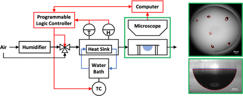 Crystallization is a potential cost-effective alternative to chromatography for the purification of biotherapeutic proteins. Crystallization kinetics are required for the design and control of such processes, but only a limited quantity of proteins is available during the initial stage of process development. This article describes the design of a droplet-based evaporative system for the evaluation of candidate crystallization conditions and the estimation of kinetics using only a droplet (on the order of μL) of protein solution. The temperature and humidity of air fed to a flow cell containing the droplet are controlled for evaporation and rehydration of the droplet, which are used for manipulating supersaturation. Dual-angle images of the droplet are taken and analyzed on-line to obtain the droplet volume and crystal sizes. Crystallization kinetics are estimated based on a first-principles process model and experimental data. Tight control of temperature and humidity of the air, fast and accurate image analysis, and accurate estimation of crystallization kinetics are experimentally demonstrated for a model protein lysozyme. The estimated kinetics are suitable for the model-based design and control of protein crystallization processes.